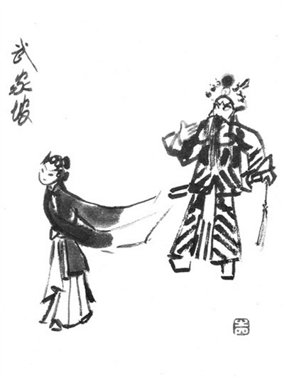 李滨声画中的王宝钏在武家坡前怒形于色,薛平贵愧喜难掩。