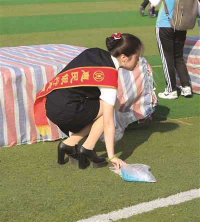10时左右,在观众兴致勃勃地为运动员呐喊、助威、加油时,几位身着藏青色套装、肩披绶带的女志愿者们正在将场地上的饮料瓶、塑料袋捡拾到手中的袋子里,她们的脸颊已被晒得红红的,汗水挂在双鬓,这一切都没影响她们继续手中的工作……她们,就是由白城洮北惠民村镇银行工作人员组成的志愿服务队的志愿者。