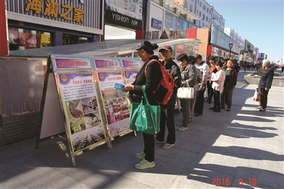 图为市民正在观看宣传教育展板及人防知识手册。 张德峰 徐文忠摄