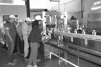 厂区占地面积10400平方米的镇赉县莫莫格蒙泉天然矿泉水有限责任公司,自2004年8月正式投产以来,已累计投资3971.85万元。2014年,公司对厂房车间、技术设备进行了第二次扩建改造,引进了国内最先进的全自动生产设备及生产线,产品主要以桶装水、瓶装天然矿泉水、天然弱碱水为主。自2004年以来,该公司相继被中国消费者协会评为“质量诚信消费者满意单位”“AAA级中国诚信单位”,“莫莫格蒙泉”商标相继荣获“白城市知名商标”“吉林省著名商标”之称。图为消费者参观瓶装矿泉水生产线。 田宏摄
