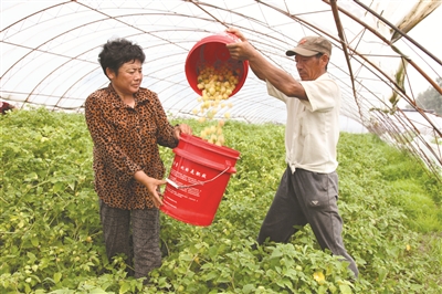 大安市推出合作经营模式帮助贫困户脱贫。今年大安新成立的种养业专业合作社达91个,吸纳1000多个贫困户加入。它组织起贫困农民形成“抱团效应”,提高了农业市场化、规模化、集约化程度,降低经营风险。图为大安市太山镇合作社农民在大棚里采摘菇娘。 于淼摄