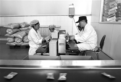 9月24日,广灵县一家农业企业的工人在车间内分装小米。