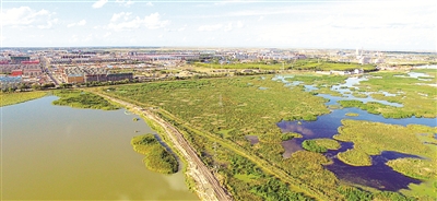 镇赉县在推进“省生态城镇化试点县”建设基础上,积极争创“国家级生态城镇试点”, 巩固镇赉“中国宜居城镇”成果。他们完善了南湖生态园基础设施建设,打造精品两湖水系工程,构建“两湖环抱,七湖联珠”的城市生态布局,不断提高城市净化、绿化、美化、亮化水平,打造宜居、宜业、宜游生态文明县城。图为镇赉县城鸟瞰。