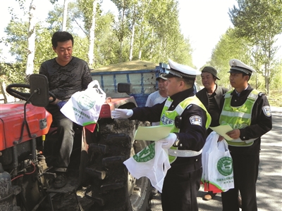 为提高广大农民交通安全意识,确保秋收交通安全,连日来,镇赉县公安交警大队深入全县各乡镇开展“秋收平安行”交通安全宣传活动。图为该大队民警正在向秋收的农民驾驶员及农民朋友发放宣传品,宣传秋收交通安全知识。 李文广 何继权摄