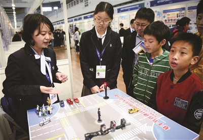 10月29日,参加终评活动的学生向参观的中学生和家长介绍自己的科创项目