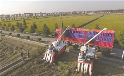 11月6日,收割机将稻谷输送至田头的卡车,准备送往加工厂进行烘干处理