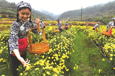近日,江西省婺源县两千余亩皇菊进入采摘期,广大茶农开始忙碌着采摘加工。2006年以来,江西婺源县大力发展可做茶饮品的有机皇菊产业,为茶乡婺源增添茶类新品