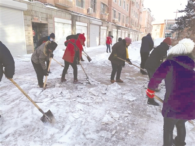 11月18日晚白城又降大雪。为方便居民出行,白城经开区幸福街道办事处按照经开区管委会清雪工作要求,反应迅速、精心安排、以雪为令,组织人员在11月19日凌晨4时进入辖区内的物业弃管小区进行清雪。460多人次参与了此次清雪,累计出动400多辆次作业车辆 许福春 本报记者李晓明摄