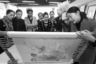 11月28日,授课老师张黎星(右一)为新疆绣娘讲解绣荷花的要领