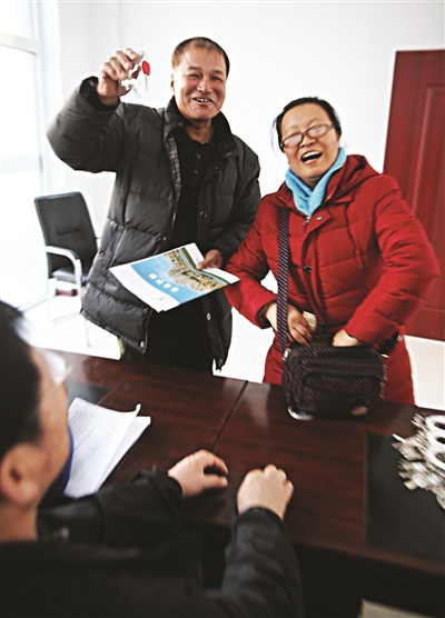 十二月四日,一对夫妻高兴地向记者展示刚刚领到的新楼房钥匙。他们的新楼房位于白城生态新区新城家园。新城家园是我市棚户区改造重点项目之一,日前已经向业主发放钥匙。据了解,春节之前,我市将有万余户居民拿到新楼房钥匙,走出低矮的平房,迁入宽敞明亮的楼房。 本报记者李晓明摄