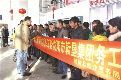 日前,通榆县就业服务部门组织兴隆山镇东风河村25名贫困劳动力到沈阳市耘垦集团务工,并指派专人护送到企业。就业服务部门将对这些外出务工人员进行定期跟踪回访,确保农民工合法权益不受侵害,使他们稳定就业,增加收入。图为就业服务部门工作人员在火车站欢送农民工,并为他们发放《农民工创业就业维权手册》,讲解维权常识 赵明峰 郑春光摄