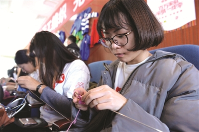 12月16日,女大学生在活动现场织“爱心毛衣”。当日,“恒爱行动”暨女大学生爱心寒假作业活动在哈尔滨启动。当地10所大学的代表在活动现场领取了620斤由爱心企业捐赠的毛线,女大学生们将利用寒假时间编织成毛衣,捐给新疆贫困儿童 新华社记者王凯摄