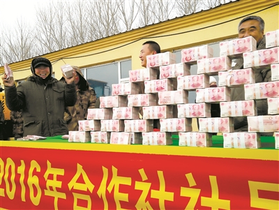 前不久,大安市丰顺综合服务型烟农专业合作社举行分红仪式,72户社员共分红660多万元。图为领到分红款的烟农喜笑颜开 郭文宇 姜伟明摄