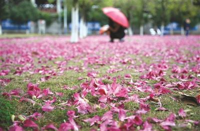12月26日,在广西柳州市体育路体育公园,一名市民在落满红花的树下拍照。受冷空气南下影响,广西柳州市区盛开的数万株红花羊蹄甲被风吹落,不少街道和公园出现“落红满地”的景象 新华社记者黎寒池摄