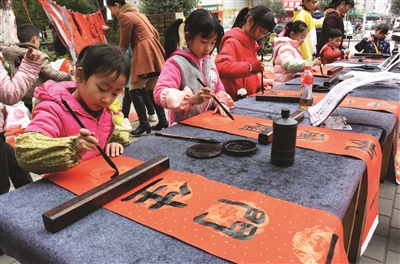 1月21日,小学生在广西柳州市潭中西路一处小公园内书写春联。当日,广西柳州市金绿洲小区一个书法培训班组织20多名小学生为市民书写春联,喜迎新春佳节