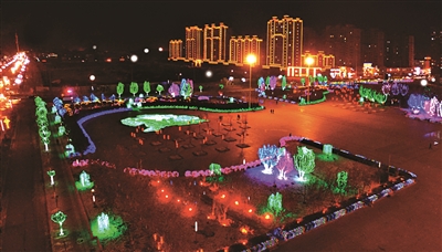 春节临近,我市大街小巷张灯结彩,临街路两旁、环岛广场霓虹闪烁,节日气氛越来越浓。图为夜色中的市区阳光广场 本报记者李晓明摄