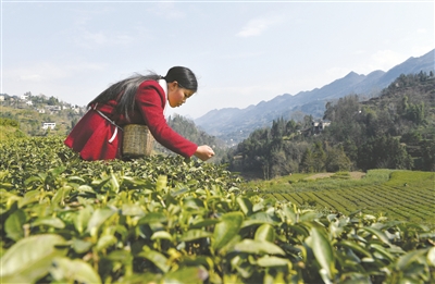 2月27日,湖北省宣恩县万寨乡向家村茶农路丹在采摘春茶。