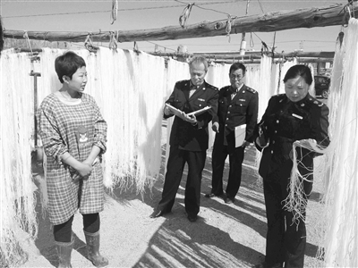 为从源头上确保粉条质量,日前,洮南市市场监督管理局食品生产流通监管科会同万宝管理所深入所辖乡镇粉坊,从证照持有、原料来源及储存条件、车间卫生、索证索票等方面进行检查,并要求粉条加工户增强质量意识、强化人员培训、完善管理制度,在原料选用、工艺流程、成品检验等环节严格把关,规范操作。图为执法人员在粉坊查看粉条加工质量。