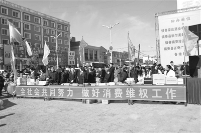 座谈会后,县委宣传部、市场监督管理局和消费者协会举行了2017年3·15国际消费者权益日大会。在县城区正阳北街友谊广场,50余家企事业单位和商户设立了咨询台、商品展台和宣传板,消费者参与热情高涨,场面热烈。县市场监督局100余名干部职工现场设立了消费者投诉台、食品检测台和假冒伪劣展示台,为消费者讲解《消费者权益保护法》《直销管理条例》等法律法规,让群众了解网络消费维权知识。当天,参与活动的各部门和单位共出动执法人员400余人,发放宣传单2万余份,现场咨询200余人次,受理投诉15起,销毁了价值15万元的假冒伪劣商品。主办单位还向吉视传媒等11个消费者满意单位颁发了诚信牌匾,吉视传媒镇赉分公司代表2016年度消费者满意单位宣读了《2017年度3·15诚信经营承诺书》,向消费者保证严格履行承诺内容、营造放心消费环境。市场监督局现场提醒广大消费者,消费权益受到侵害时拨打12315。过往群众表示,今年3·15国际消费者权益日大会,让人们进一步了解到更多消费维权知识,能够有效预防消费欺诈、提升维权意识、规范市场经营主体的行为。参与活动的商家和企业在现场与消费者零距离接触,倾听群众声音,帮助解决问题。