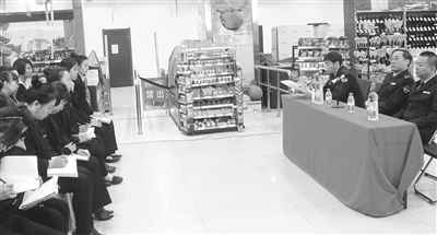 为进一步增强消费者食品安全意识和维权意识,近日,白城市食品药品监督管理局化妆品分局组织监督执法人员深入到市区欧亚购物中心和洮北区新立街道办事处开展了食品安全知识宣传、培训活动,并发放宣传资料1500余份。图为执法人员对欧亚购物中心超市食品区员工进行培训。 本报记者张殿文摄