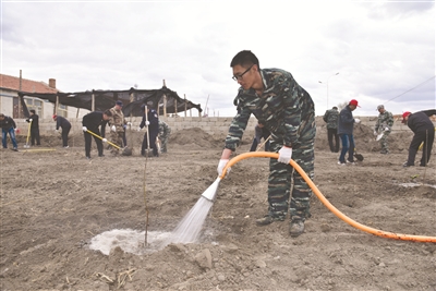 4月18日,在洮北区德顺蒙古族乡城四家子村,市党史办、城管局,洮北区委办公室等市、区包保部门驻村干部同群众一起开展果树栽植,帮助贫困户发展庭院经济。当日共栽植2年生“寒富”苹果苗5000株,两年后可获得收益,预计年增收18万元。 洮宣摄