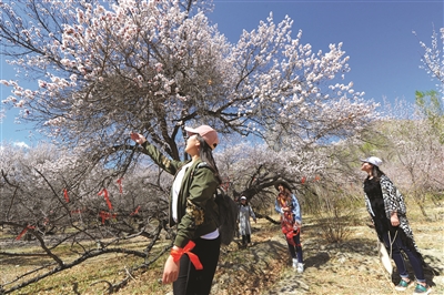 4月22日,游客在哈密市伊吾县苇子峡乡野山杏林里赏花。