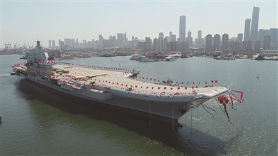 4月26日,我国第二艘航空母舰下水仪式在中国船舶重工集团公司大连造船厂举行。图为航空母舰在拖曳牵引下缓缓移出船坞,停靠码头。