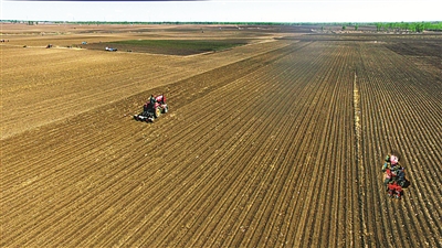 春光明媚,万物复苏。在我市各地,随处可见忙碌于田间地头的农民,听到农业机械的轰鸣,全市春耕生产的大幕已经拉开。图为洮北区青山镇农民在耕作。 本报记者李晓明摄