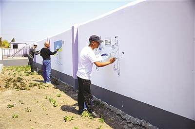 5月2日,洮北区委宣传部组织区美术家协会的美术家们深入到青山镇黎明村开展文化帮扶活动,为黎明村绘制社会主义核心价值观文化墙,增添文化气息,营造脱贫攻坚良好氛围。 王维俊 本报记者张殿文摄