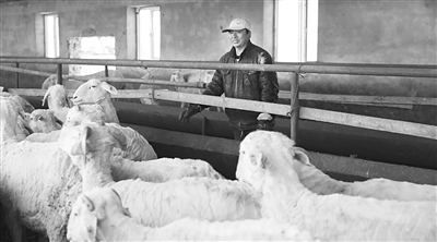 大安市采取贫困户自愿的原则,由政府出资采购羊,合作社托管饲养,每年给贫困户固定收益金,带动贫困户脱贫。图为大安市联合乡贫困户王晓春看着养殖合作社里自己的4只羊,笑得合不拢嘴。 本报记者李晓明摄