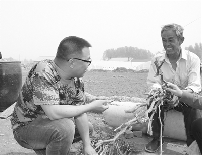 镇赉县人社局出资5万元为包保的哈吐气蒙古族乡宝山村200多户贫困村民购买了1000多株葡萄树苗发展庭院经济。5月3日,该局党员干部到贫困村民家义务劳动一天,帮助栽植葡萄树苗。图为韭菜屯的贫困户手拿葡萄树苗难掩高兴心情。 田宏摄