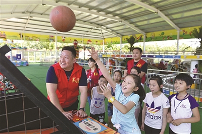 5月24日,河北省邢台市留守家庭服务协会会员李义超(左一)带领留守儿童玩投篮。