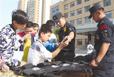 5月28日,菏泽市特教中心的聋哑青少年观看警用装备。当日,山东省菏泽市公安局牡丹分局特巡警大队邀请市特教中心的聋哑青少年来到警营,参观现代化的警用装备,观看警务实战技能表演,迎接“六一”儿童节。 新华社记者刘心中摄