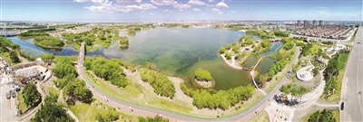 近年来,我市深入践行绿色发展理念,大力推动生态环境建设,营造天更蓝、水更清、空气更清新的生态环境,让人民生活得更加幸福。图为生态新区鹤鸣湖鸟瞰。