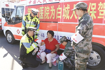 在白城一中考点门口,送孙子考试的70岁张奶奶突发高血压,被执勤民警送至解放军第三二一医院急救车进行了急救,并发放了急救药品。