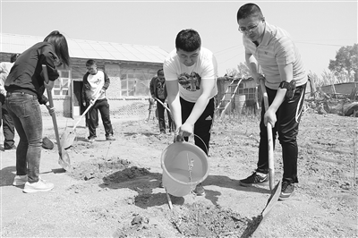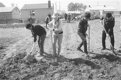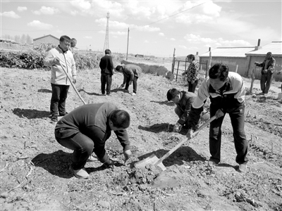 | 大安市委政法委扶贫工作队帮助龙沼镇长春岭村贫困户栽植树莓,发展庭院经济。 于淼摄 |