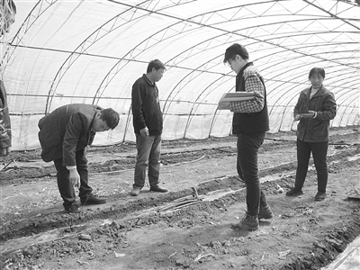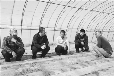 | 共青团大安市委扶贫工作队帮助贫困户总结棚苗栽植经验。 于淼摄 |