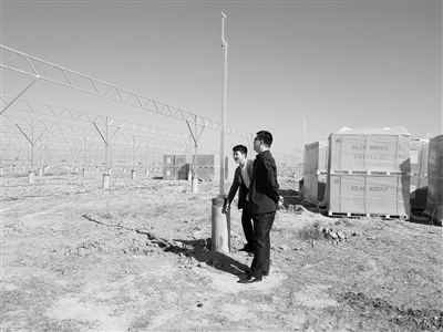 | 大安市民政局扶贫工作队在烧锅镇新平村光伏发电项目现场查看建设情况。 于淼摄 |