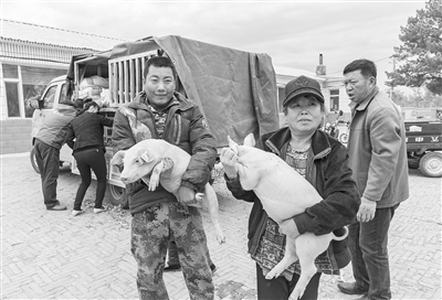 | 大安市残联扶贫工作队为适合发展庭院养殖的贫困户发放仔猪和饲料。 崔凤戈摄 |