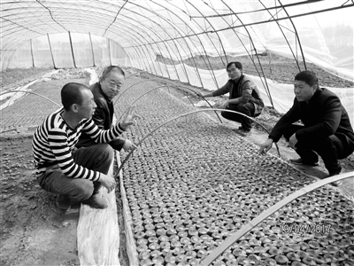 | 大安市政务服务中心扶贫工作队帮助大岗子镇双岗子村贫困户贾政国研究花卉种植方向。 于淼摄 |