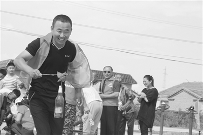 | 嘎什根乡创业村党员参加文体活动中的“吊瓶赛跑”。 田宏摄 |