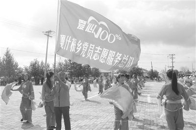 | 嘎什根乡党员志愿服务总队参加“庆七一”活动时发出“助推脱贫攻坚,建设美丽乡村”的倡议,并组织志愿者以群众喜闻乐见的形式进行宣传。 田宏摄 |