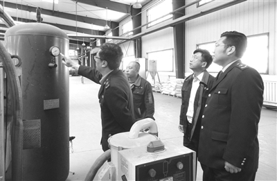 日前,洮南市市场监督管理局郊区管理所联合局特种设备安全监察科开展了压力管道等特种设备安全排查整治行动,重点检查使用压力管道的企业是否具备安装资质、是否经过安装质量监督检验或定期检验、操作人员是否持证上岗、是否有事故应急预案等。并结合宣传落实《特种设备安全法》,帮助企业建立健全应急预案及安全生产制度措施,增强责任意识,消除安全隐患。图为执法人员在企业检查生产设备压力表。 马瑶 本报记者张殿文摄