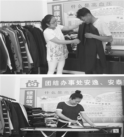 下图社区工作人员把捐来的衣物进行分类熨烫、整理。