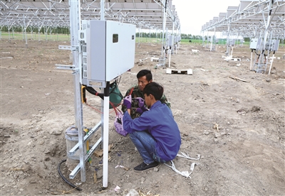 洮北区到保镇到保村光伏扶贫电站近日并网发电。电站装机容量1.5兆瓦,占地面积3.4公顷,总投资1125万元,年发电总量约为225万千瓦时,年总收益约198万元,每个贫困村将得到不少于30万元的收益。图为工作人员正在调试设备。
