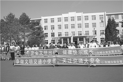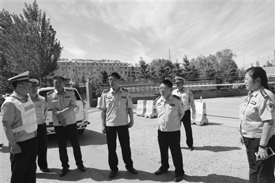 中兴路与光明北街路口。负责执守在这里的是市交警支队经开大队一中队中队长程兵,他身材魁梧,脸膛呈红黑色,显而易见是长期在烈日下暴晒的结果。笔者见到他时,早高峰时间已过近一个小时,但是他和两名年轻协警仍在路边执勤。据程兵介绍,他负责执守中兴路与光明街及幸福街大象两个较大路口,其中光明街与中兴路交叉路口连接着白城师范学院、白城中心医院及光明街早市周边多个小区,路口四个方向车流滚滚、人流不断,是市区道路中车流量最大、交通疏导最紧张最繁忙的路段。就是在这样的路上,程兵领着几个年轻协警,顶着头上烈日骄阳,吸着呛人的尘土尾气,日复一日地坚守在路面上,指挥疏导过往车流人流,不敢稍有松懈。忙起来半天顾不上喝一口水,只能临时替换下来,打开矿泉水瓶猛灌几口,赶紧再顶上去。