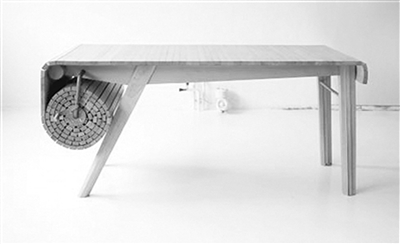 当它在最基本的尺寸,即1.5米长、0.8米宽的时候,可以满足2—4人的就餐需求,而一旦你转动把手,履带一样的结构就能自动延伸到最长4米,并且带动另一端的桌子腿每隔一段距离就新增一对出来——是的,桌子另外一端的桌子腿有3对,平时并在一起,伸展的时候就能自动根据桌面长度散开,保证大概每隔1米就有一对桌子腿。
