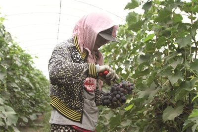 洮北区青山镇大力发展棚膜经济,近年来取得了良好的效益。日前,记者在青山镇红星村了解到,该村共有葡萄大棚215栋,种植面积近200亩,产品远销黑龙江和内蒙古等地,年利润达300多万元。目前还带动了10余户贫困户,通过自家庭院搭建大棚种植葡萄,为脱贫攻坚发挥了重要作用。图为红星村的葡萄种植大户李荣香在自家大棚中剪葡萄。 本报记者马彬摄