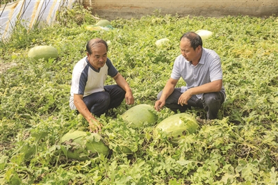 洮南市黑水镇五一村大力发展专业合作社,向精品农业发展。该村农民韩景文利用大棚培育的特大西瓜达百斤以上,每个大西瓜可实现销售收入500元,获得良好的经济收益。图为韩景文和洮南科协工作人员在观察西瓜的长势。 邱会宁摄