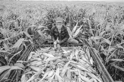 吉林省金塔集团洮南高新技术农场种植的粘玉米已进入收获期。为保证粘玉米鲜食度,他们在采收4小时后蒸熟并冷藏,产品在市场需求度高,获得了良好的收益。图为8月25日农场职工正在采收粘玉米。 邱会宁摄